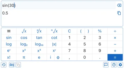 * Input for trigonometric functions can be in Degrees, Radians or Grads. You can choose input type by pressing 'Deg-Rad-Grd' button.