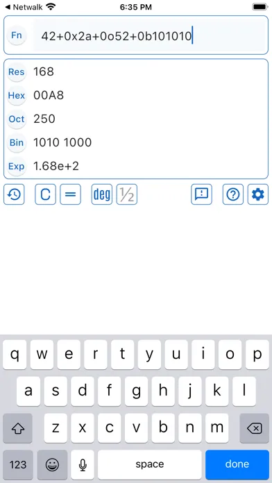 42+0x2a+0o52+0b101010, Result: '168' - basic arithmetic functions and ability to enter in different number bases.