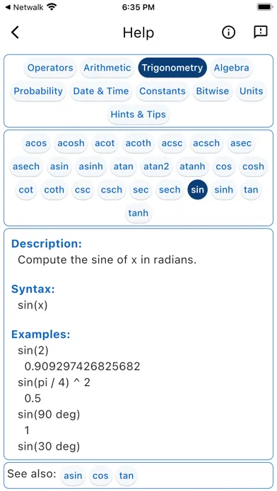 sin(0.5)^2+cos(0.5)^2, Result: '1' - trigonometric calculations.