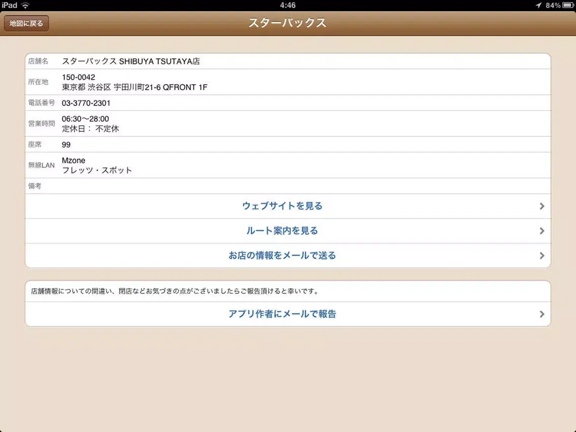 住所や距離、営業時間のほか、店舗によりますが無線LANの有無、座席数の情報を見ることができます。