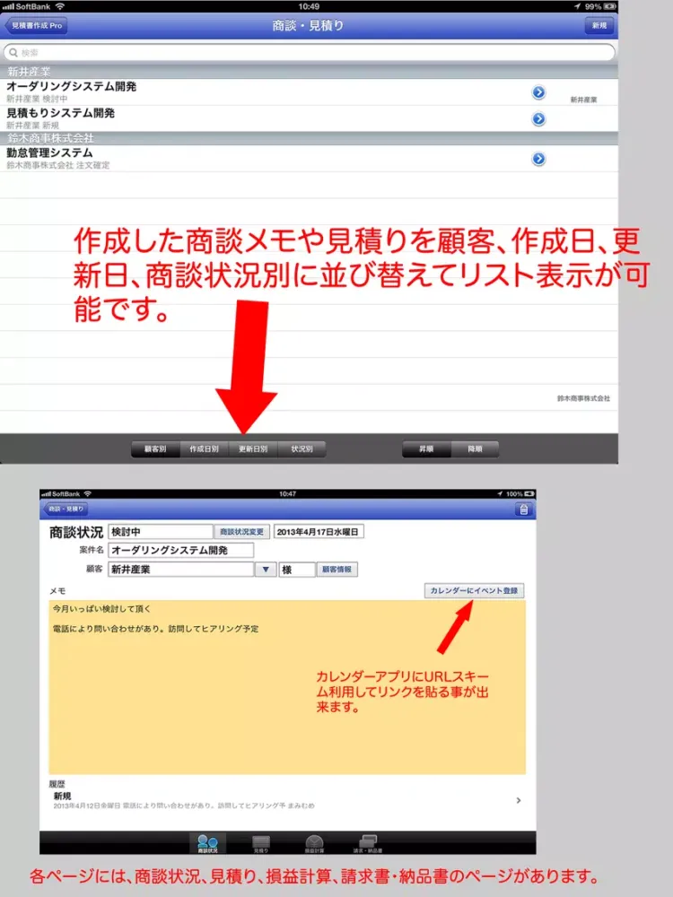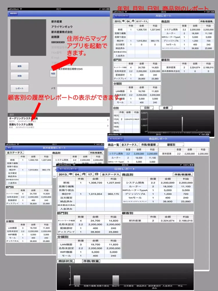 さらに、見積書の作成を中心に日々の営業活動に必要な事を書き留める事ができ、年別、月別、顧客別、商品別のレポートを表示する事ができるアプリです。