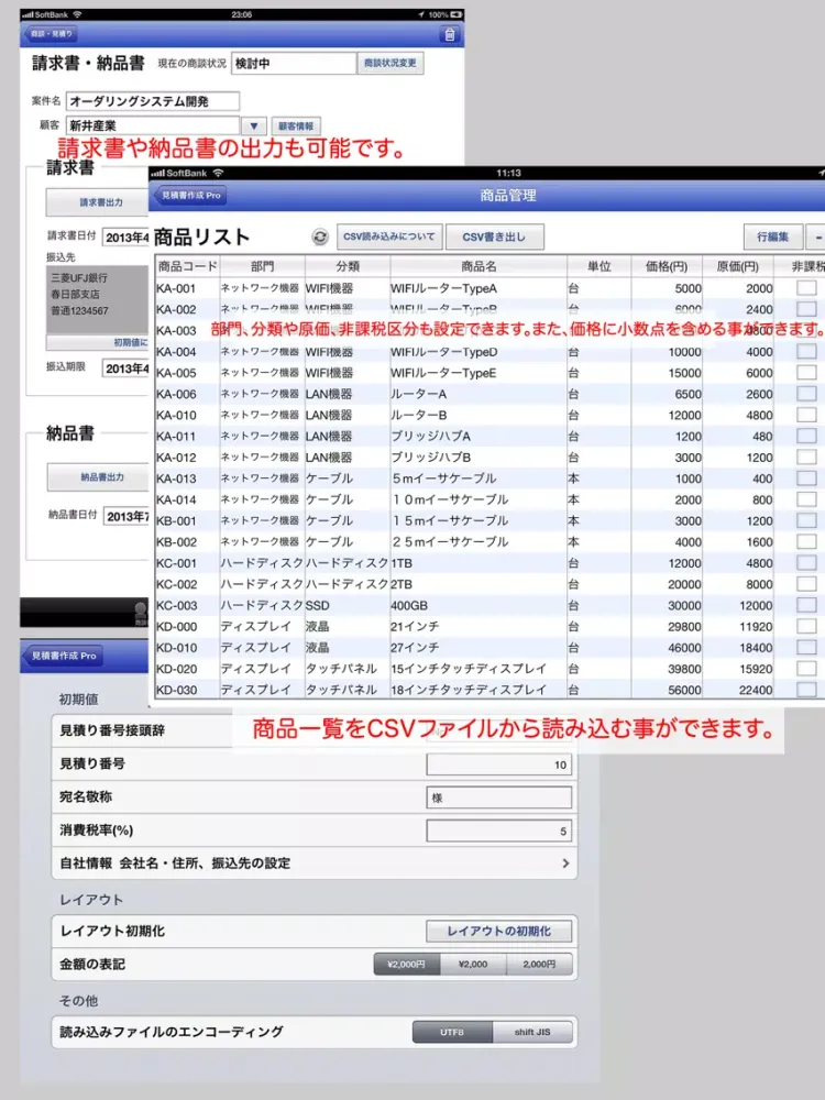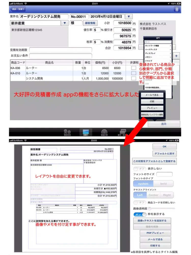 見積書作成 appの機能(見積書、請求書、納品書を作成し印刷またはPDFファイルにしてメールする機能)はそのままに、レイアウト編集、商品データCSV出力もアドオン購入無しでお使い頂けます。