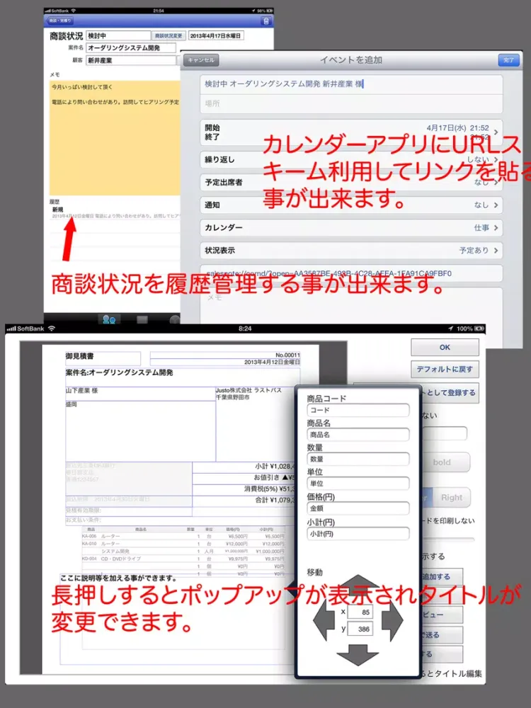 ・URLスキームを利用して、カレンダーアプリ等に見積り/商談メモのページのリンクを貼付ける事ができます。
