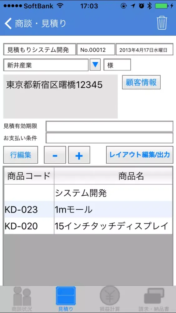 ・見積書、請求書、納品書を作成し、印刷やメール送信(PDF)で出力することができるアプリです。