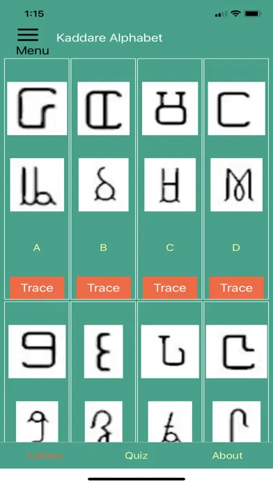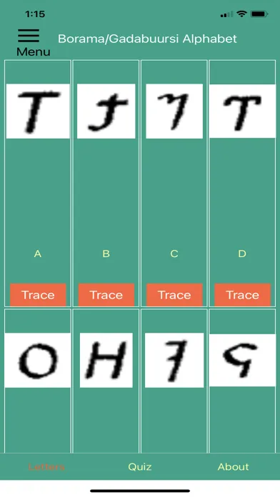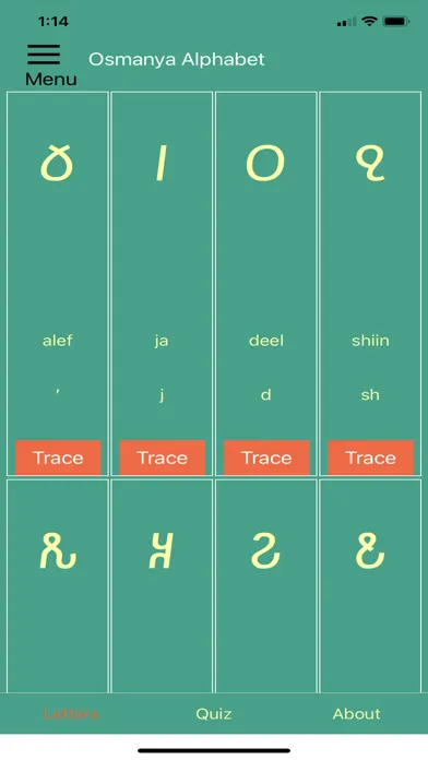 This app can help you get to know some of the indigenous Somali alphabets. Scroll through the letters and study their shapes and sounds. Practice tracing each one until you're familiar-- then quiz yourself on the letters!