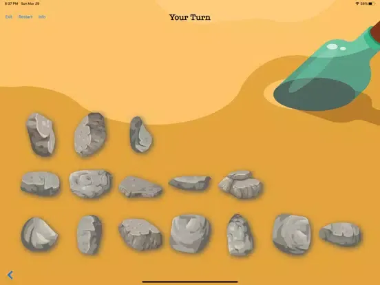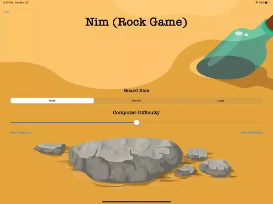 Nim has 3 different board sizes and the difficulty level of computer play can be adjusted. At any difficulty level, the computer will get smarter with every loss it takes. Challenge yourself to find patterns to win at the highest difficulty.
