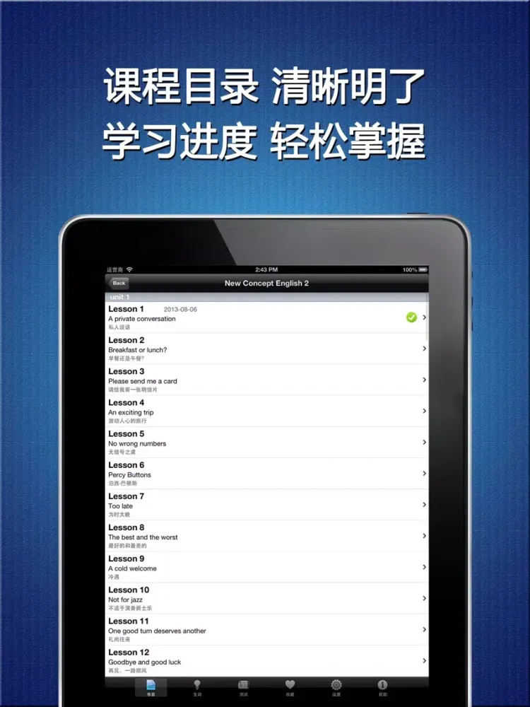 《新概念英语》提供了进度管理, 时间管理, 每本书, 每个课程, 每个生词都有学习进度, 学习时间, 精确掌控学习进度.