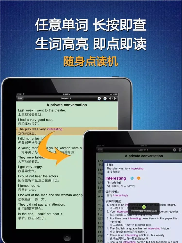 《新概念英语》的每个句子都有标准的真人读音, 英汉对照, 即点即读. 文中每个英文单词都有详细的解释, 音标, 发音以及例句用法, 在阅读的时候只需在任意单词上长按超过一秒钟, 即可查阅, 即点即译, 真正做到哪里不懂点哪里.