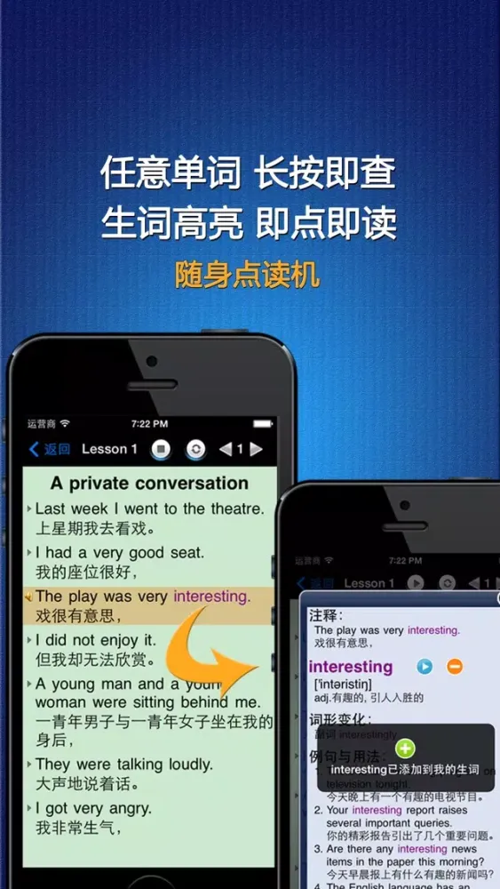 《新概念英语》全文定位点读, 同步高亮显示. 长按任意单词即弹出词典, 同时可将单词加入生词列表. 不需要进度条式的拖拽, 没有查字典的繁琐. 最新支持耳机线控操作, 使用更加轻松便捷.