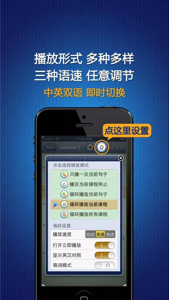 《新概念英语》提供了【生词】【收藏】【字典】【单词测试】【单词拼写】等附加功能, 可以将文中任意单词加入到【生词】, 生词在文中用【特别的颜色】标识, 把喜爱的课程加入到【收藏】, 对任意单词进行检索, 测试和拼写练习. 多种播放模式: 单句, 单句循环, 全文, 全文循环, 全书循环, 支持后台播放, 可切换英汉对照模式与纯英文模式. 新增语速调节功能, 三种语速, 任意调节.