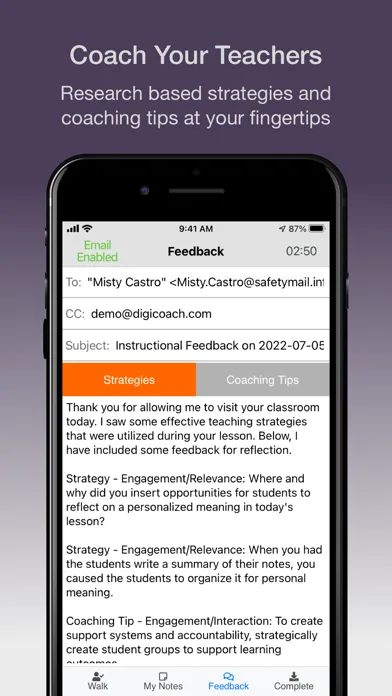 A unique feature of digiCOACH is a comprehensive built-in library of strategies and coaching tips that a user can select to include in the feedback email to a teacher. The research-based coaching tips provide strategies to help change adult behaviors to increase student achievement. Specific coaching tips are included that provide researched based techniques to help English Language Learners. These tips help instructional leaders provide quick and powerful feedback to all teachers.