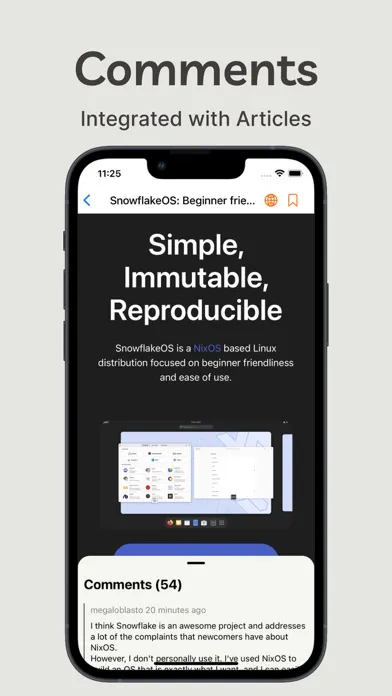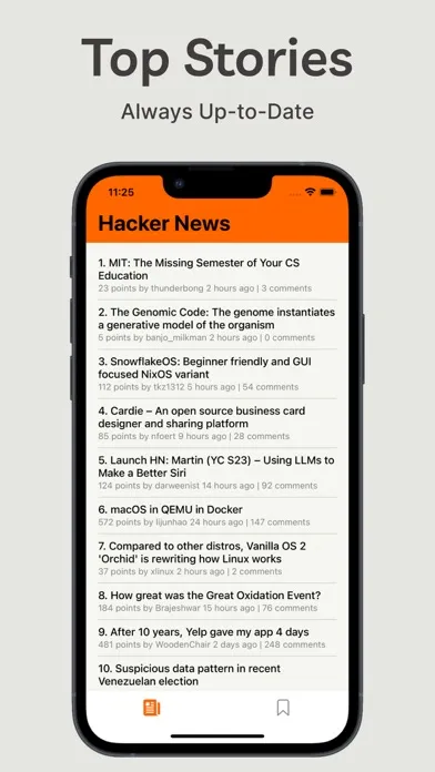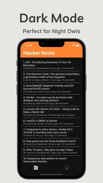 A sleek Hacker News reader with dark mode for comfortable browsing. Features top stories, integrated article and comment viewing on a single page, and bookmark functionality for saving interesting content. Stay informed and engaged with the tech community effortlessly.