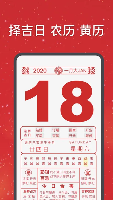 保留了农历公历日期转换,所属时辰,择吉日,每日忌宜,胎神占方,吉神宜趋,彭祖百忌,今日合害。方便广大用户查询农历数据。