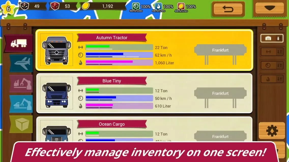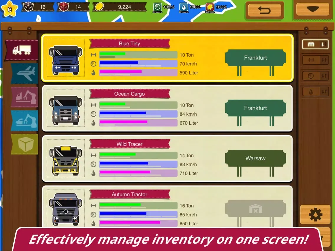 - All trucks and airplanes can upgrade speed, volume, and fuel tanks.