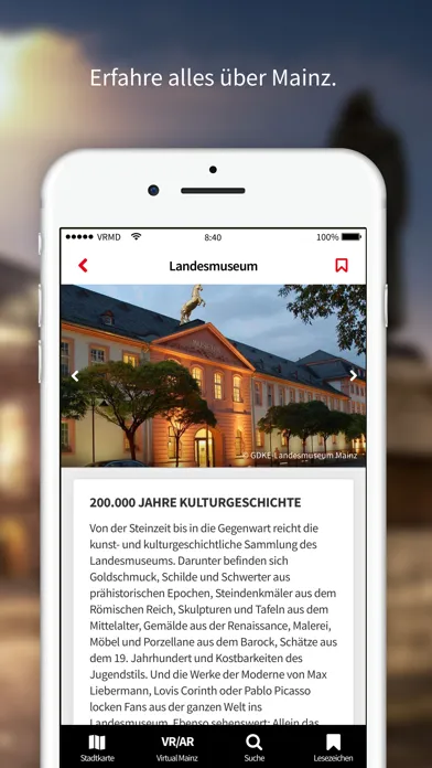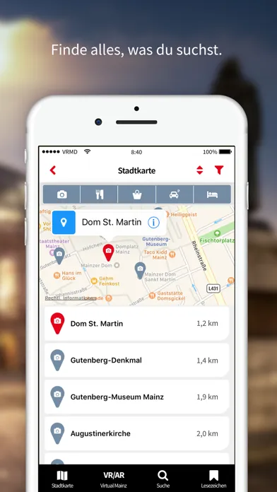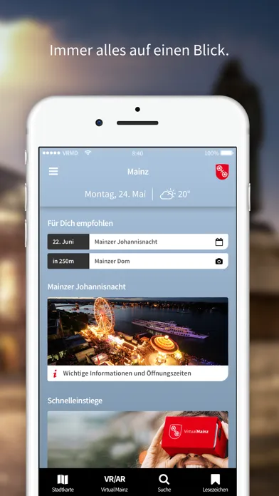 Erlebt einen besonderen Rundgang durch die Stadt am Rhein und informiert euch über alle Sehenswürdigkeiten, Unterkünfte, Einkaufs- und Gastronomieangebote. Mit dem interaktiven Veranstaltungskalender wisst ihr immer, was in der Stadt los ist. Taucht ein in die Welt der Augmented und Virtual Reality und wandert auf den Spuren Johannes Gutenbergs und den alten Römern. Spielerisch könnt ihr dabei die Stadt erkunden und euch auf die Suche nach „Gutenbergs Erbe“ machen.