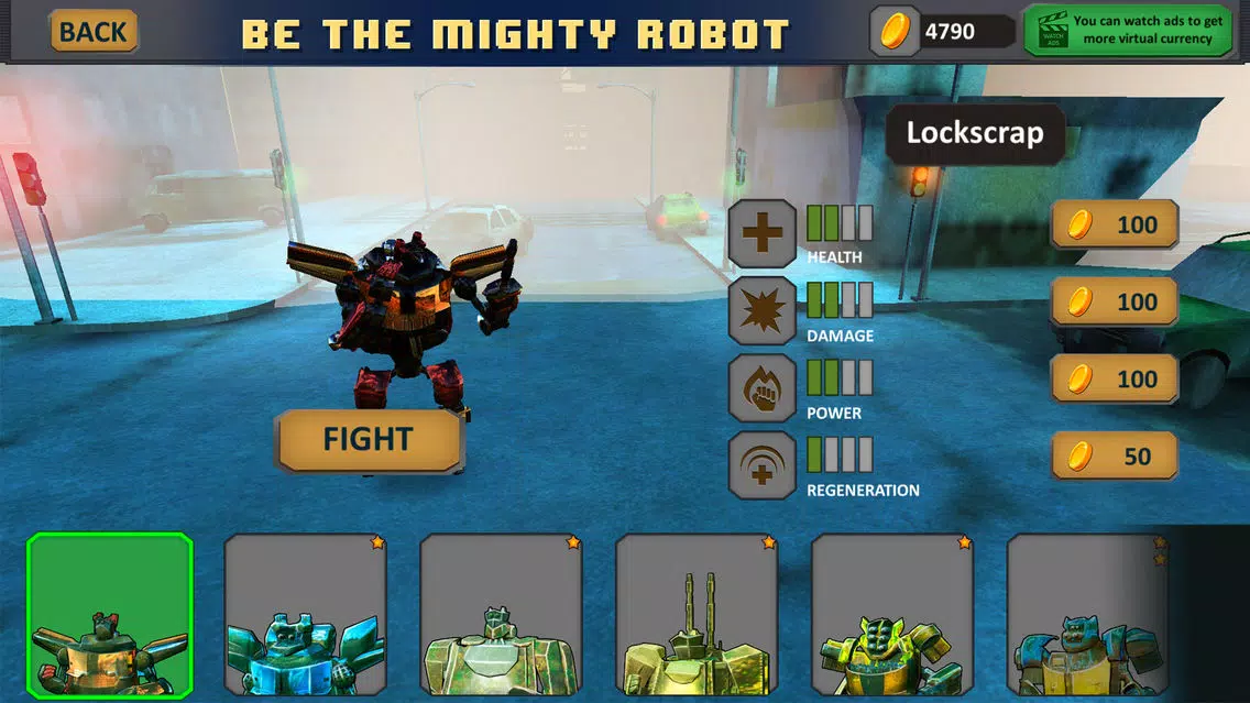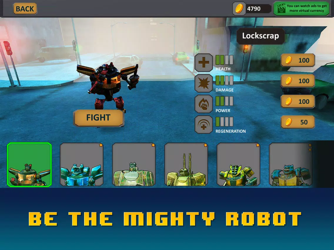 Earn points for successfully done missions and power-up your robot with the new deadly weapons and armor, or unlock new interesting locations with new furious rivals! Unlock new robot types - locomotive robot, motorbike robot, police car robot, tank robot and others!