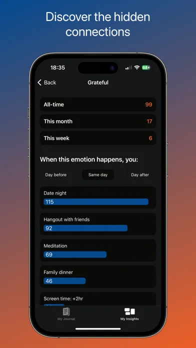 • Same Day, Day Before, Day After: Explore the ripple effect. Did that morning meditation impact your afternoon mood? System connects the dots.