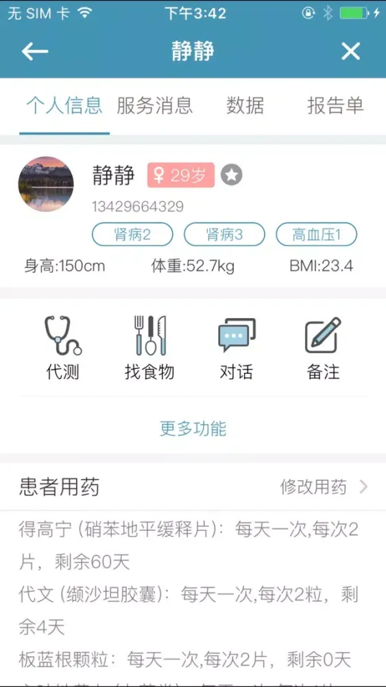 • 用药管理 —— 记录患者使用药物,用法用量等信息,并可通过用药与健康数据评估患者目前用药效果;