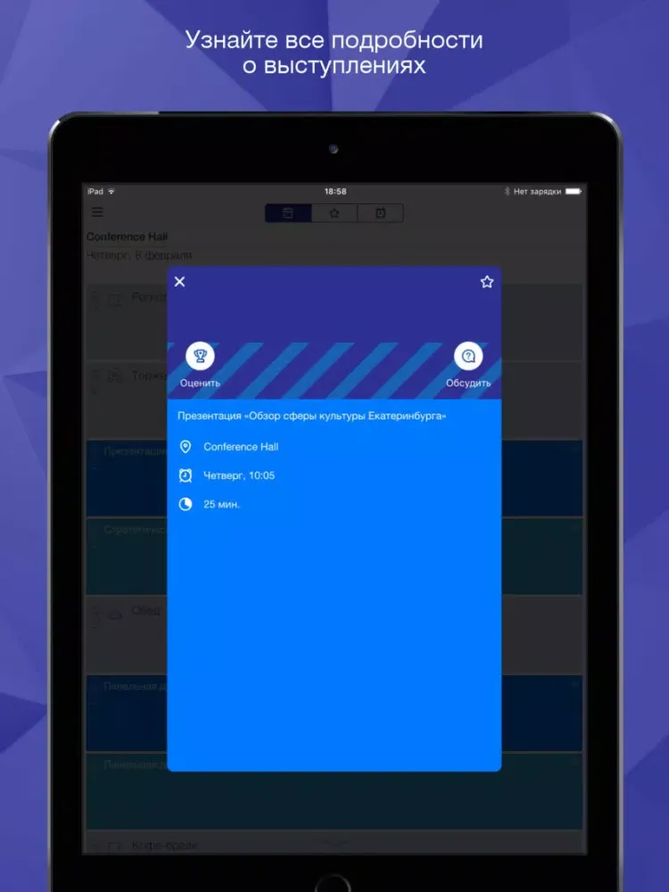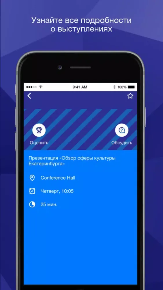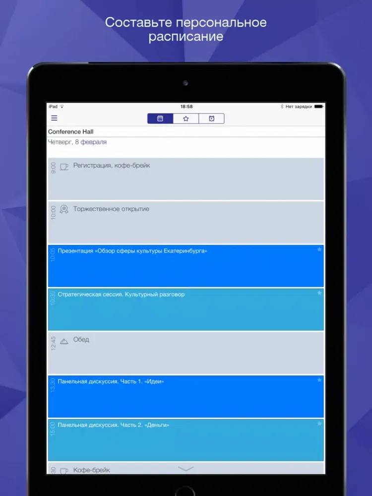 - составить собственную программу и получать оповещения о начале избранных докладов;