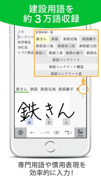 建設現場で使われる専門用語や慣用表現を簡単に効率的に入力することができます。