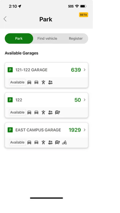 You'll be able to register your vehicles, find the right type of spot you need, and even find your car with the Parking feature.