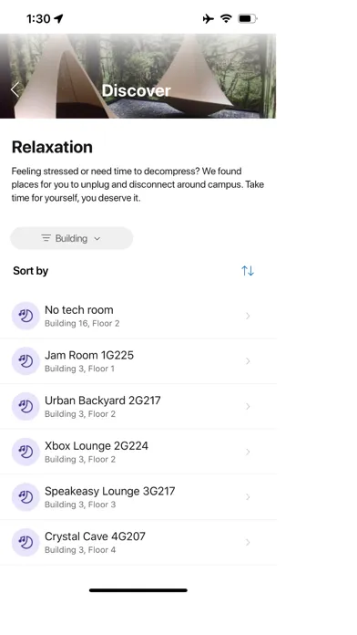 A meditation and relaxation space on campus? Yes, please. Find this delightful space, priceless pieces from the Microsoft art collection, game rooms and other amenities in the Discover feature!