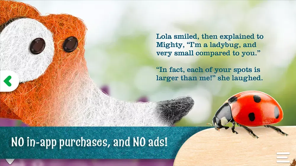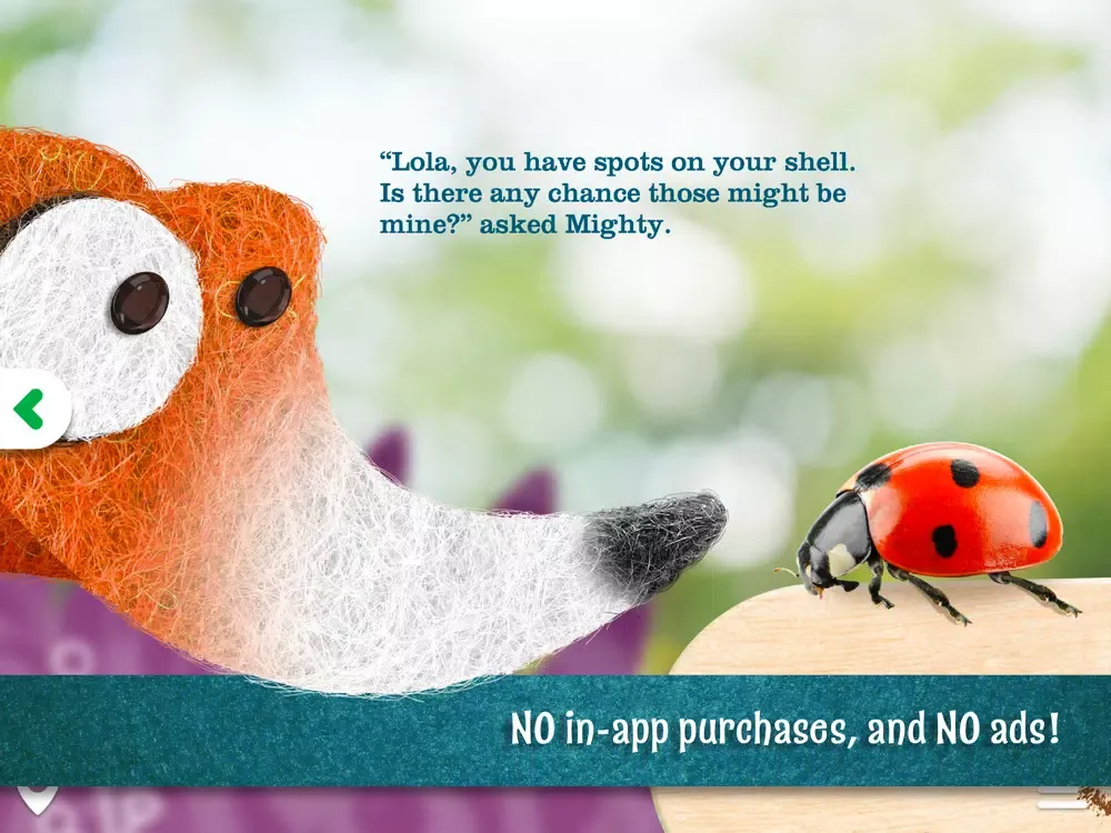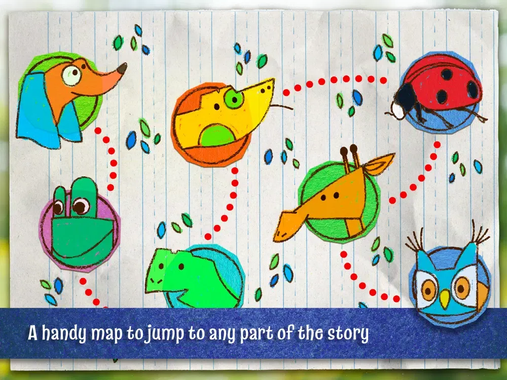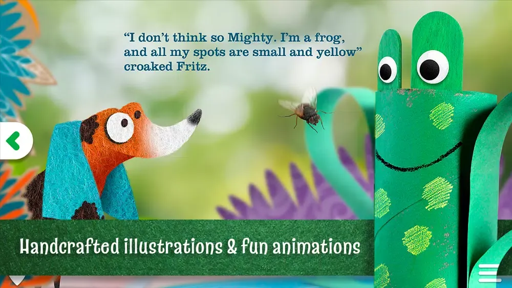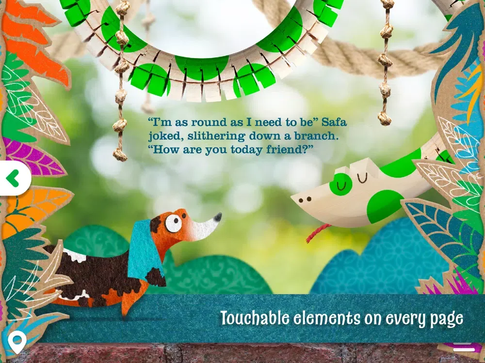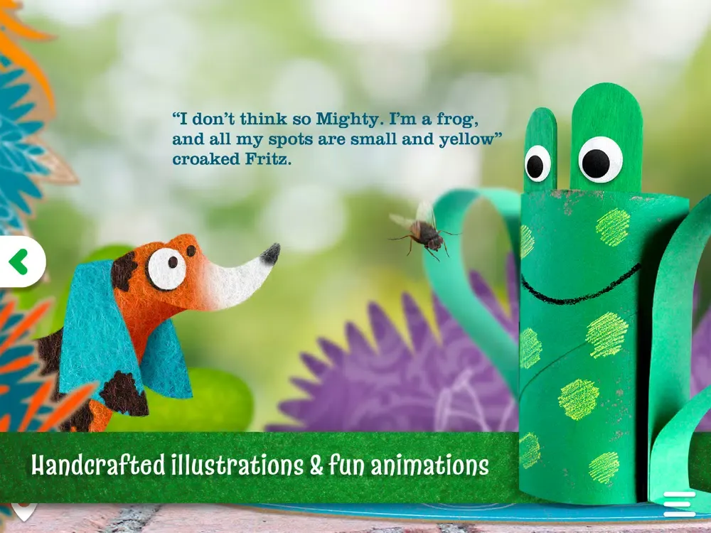 Follow Mighty the dog on his adventure through the jungle to find his missing spots. Encounter six of his dear friends along his story, each a different jungle animal. This storybook is specifically designed for toddlers and younger audiences in every way. The animations are slow and soothing, purposefully avoiding fast, jumpy movements. The interface is intuitive also. Simply touch the glowing circles when they appear to advance the story. And because younger children love repetition while learning, a map feature has been built into the book, allowing the reader to skip to their favorite characters and scenes throughout the story. When read all the way through with narration the storybook is over 15 minutes long, an immersive story your child will love returning to time and time again, whether at bedtime, in the car, or anytime.