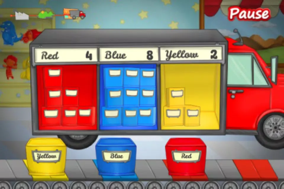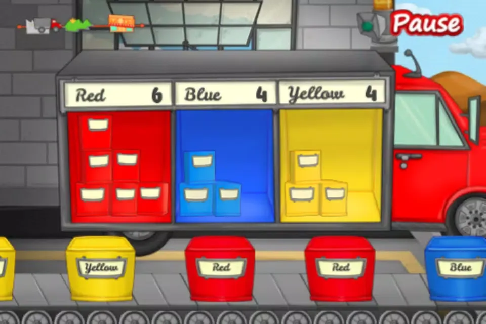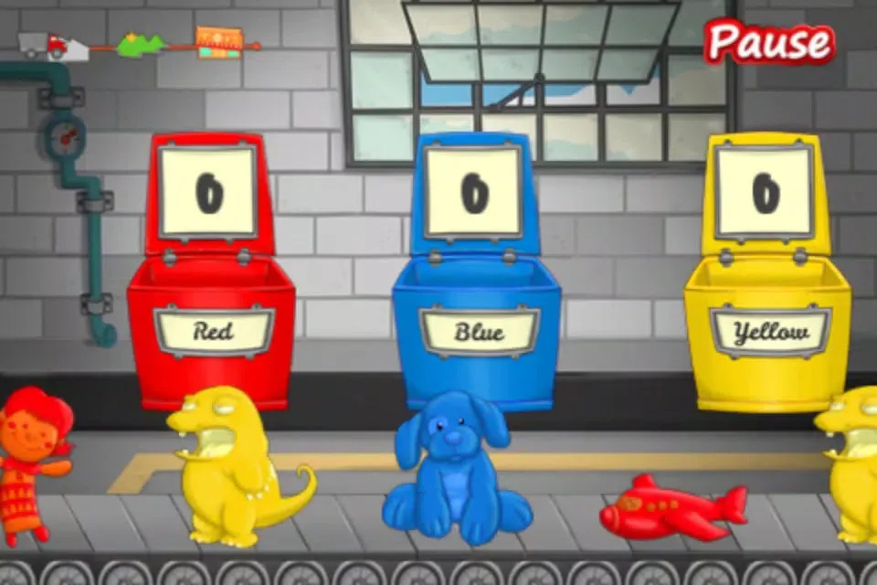 Tap and drag each red, yellow or blue toy from the conveyor belt to the corresponding toy box.