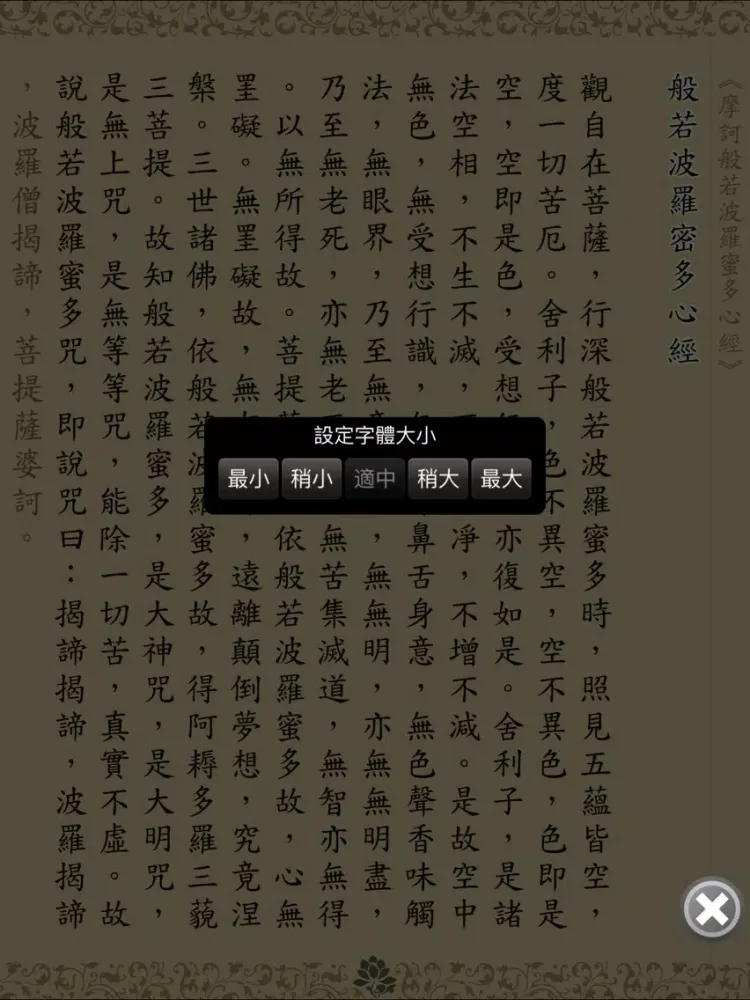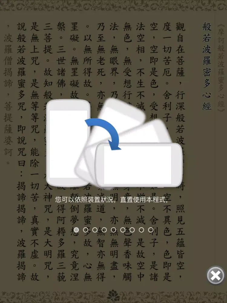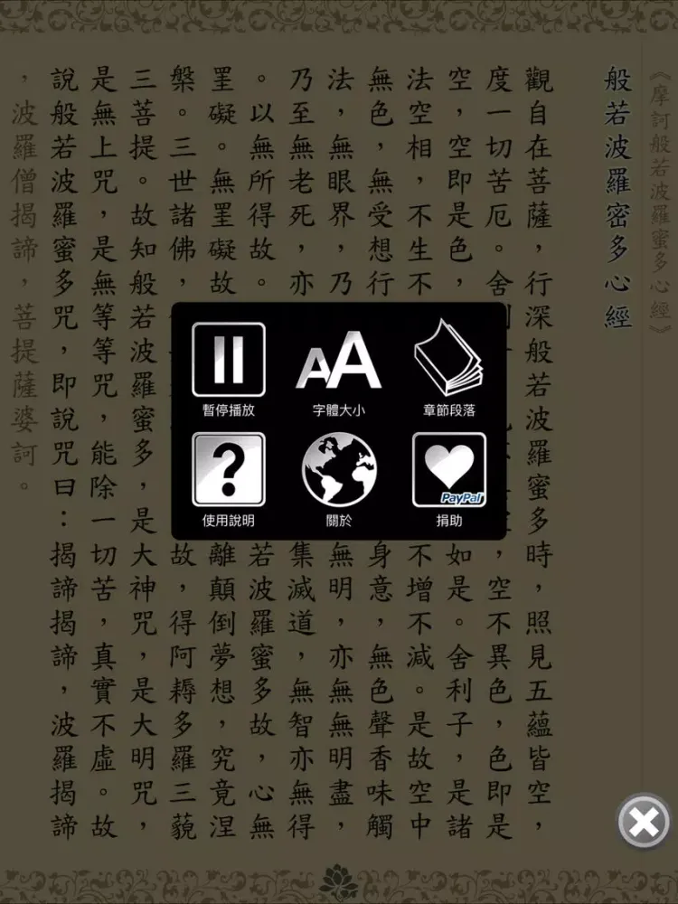 系統設計上除了念誦位置引導、自動翻頁、字體大小調整,也提供了次頁銜接的預覽功能,每頁最後一句為次頁的第一句,如此在翻頁時減少了視覺上或意識上經句銜接上的問題。更多的小細節還需要您下載使用體驗!