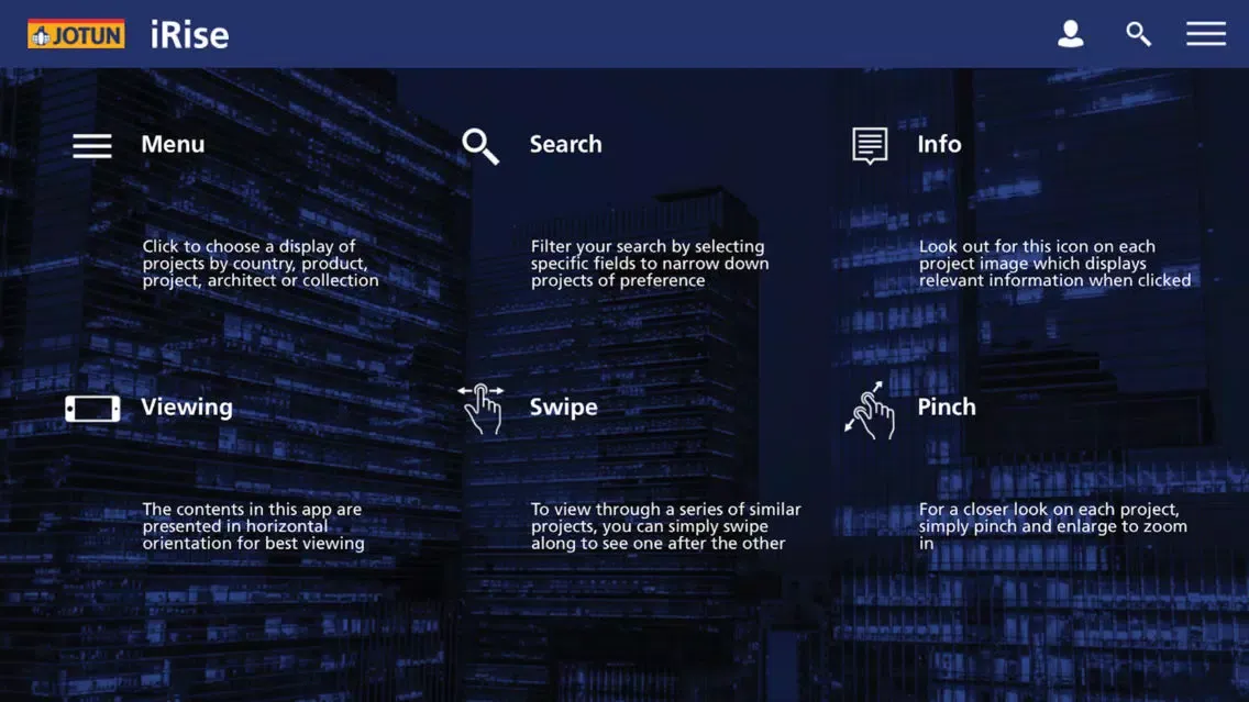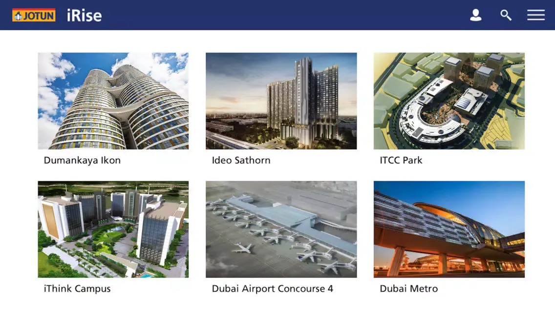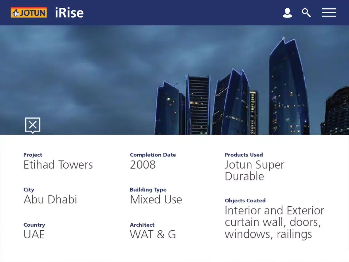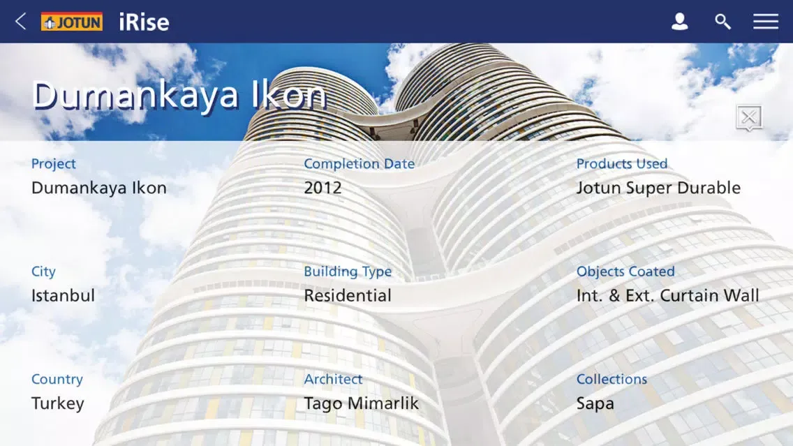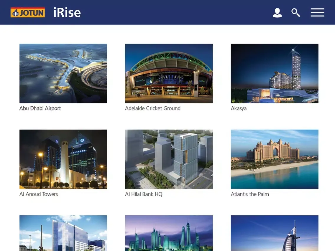 iRise is a unique project showcase app that presents the many projects where Jotun powder coating products have been implemented. You can simply navigate between world famous buildings and ionic landmarks through our easy-to-use menu and learn more details about the project, including product used, applicator and owner details, locations and year of completion.