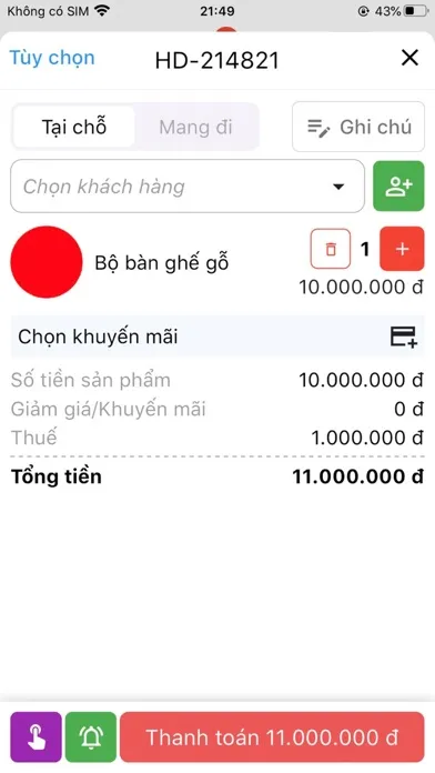 - Sử dụng các tùy chọn ăn uống để đánh dấu đơn hàng là ăn tại chỗ, mang đi hoặc giao hàng