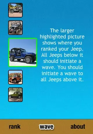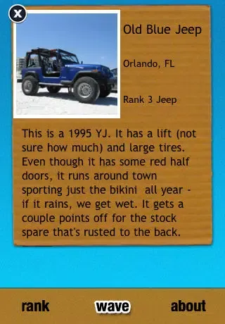 Jeep Wave is a tribute to all those Jeep Wrangler owners.This app is designed to calculate a Jeep's ranking to help figure out when to wave.