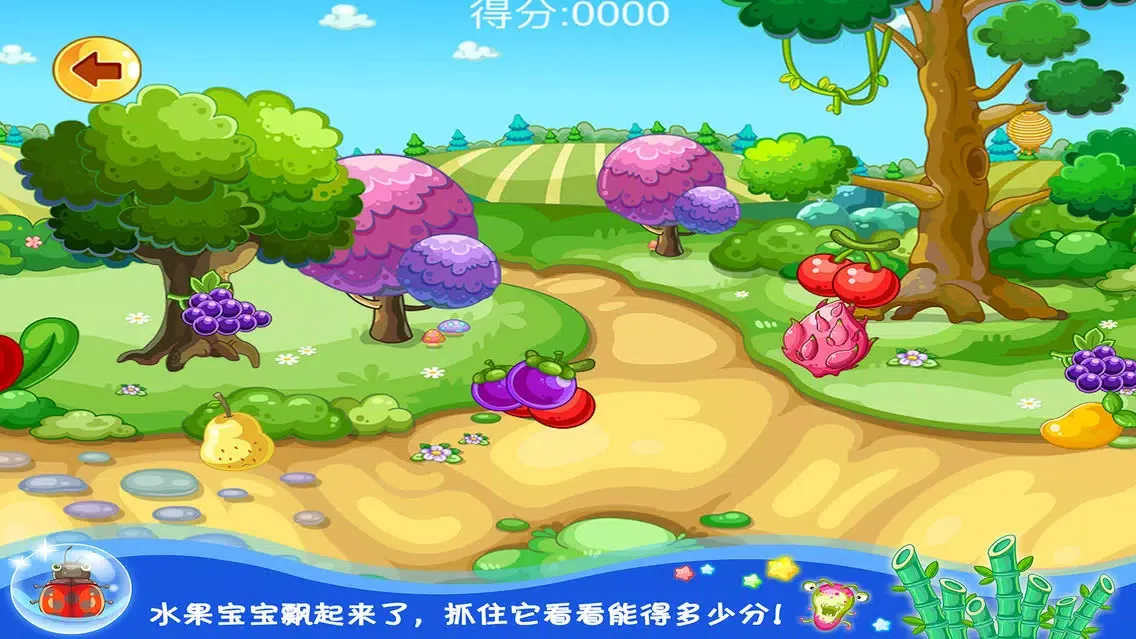 场景二:可爱的水果随意的飞舞在天空中,宝宝可以通过点击自己喜爱的水果得到分数,同时再次复习刚刚点击的水果的名字,这样的互动还可以培养宝宝的反应能力呢!