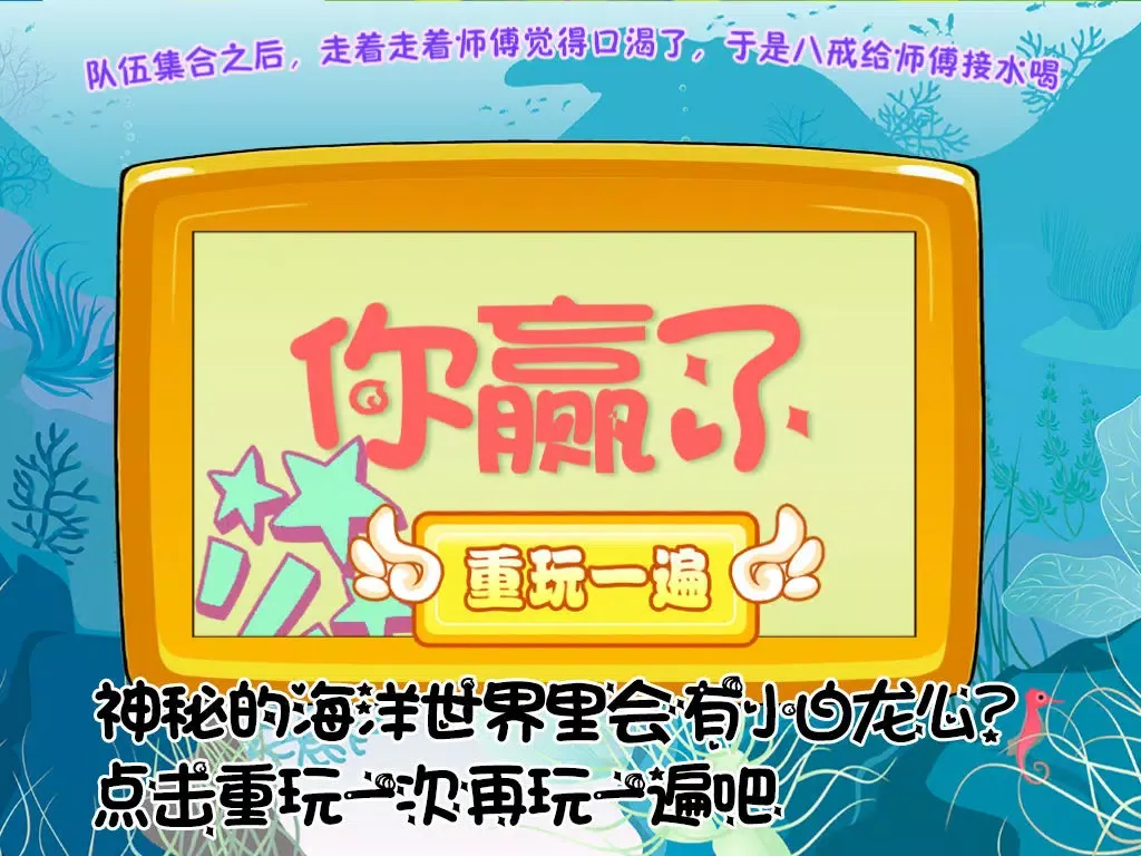 唐僧师徒一路向前走,这时候他们来到了东海的附近,突然大浪拍岸,从海里冒出了一只银色的白龙,一下子卷起了唐僧的坐骑将其卷入海中,风平浪静之后可难道了唐僧,没有了坐骑他可怎么继续向前前行呢,悟空为了不让师傅苦恼,水性并不好的他想出了一个好主意,他让师弟八戒去海中将白龙引上岸,这样悟空就有办法收复他,小朋友们他们师徒三人会平安无事么?那只小白龙又是谁呢?一起来玩此款游戏就可以告诉你答案喽。。一起来挑战吧~