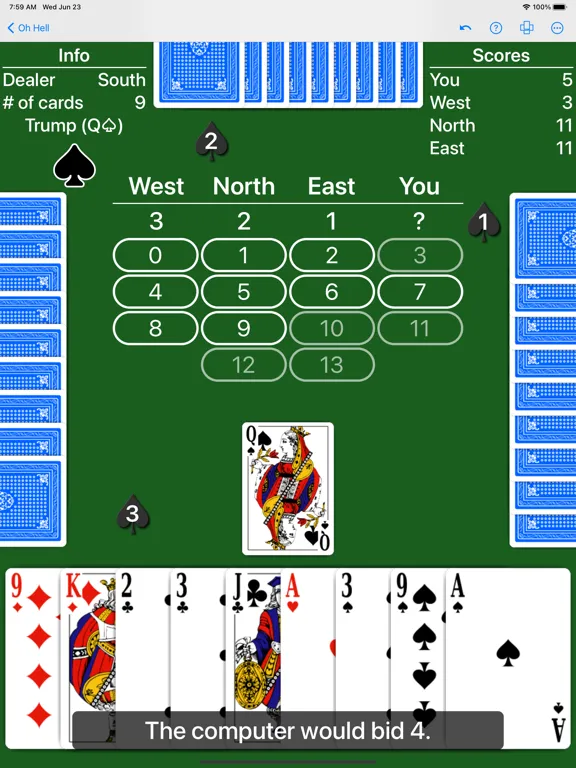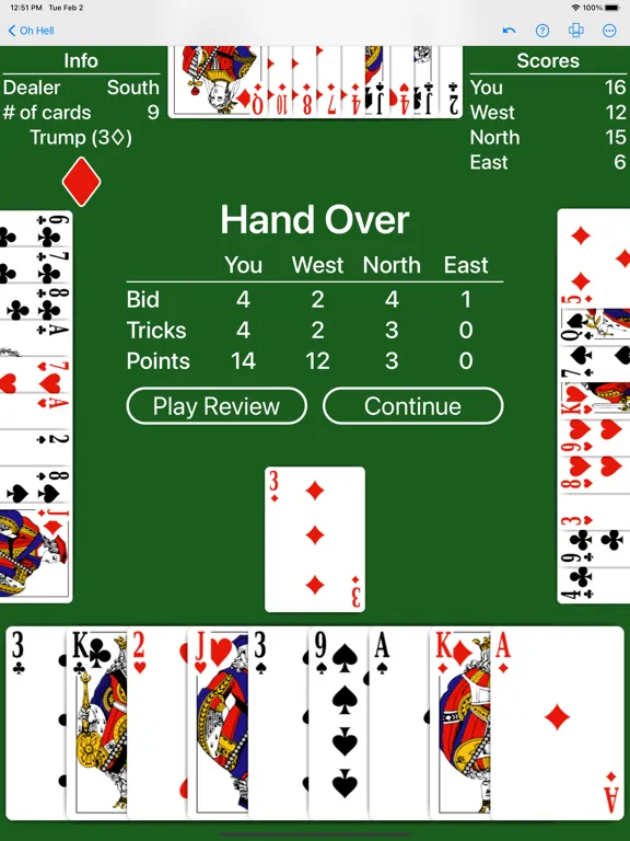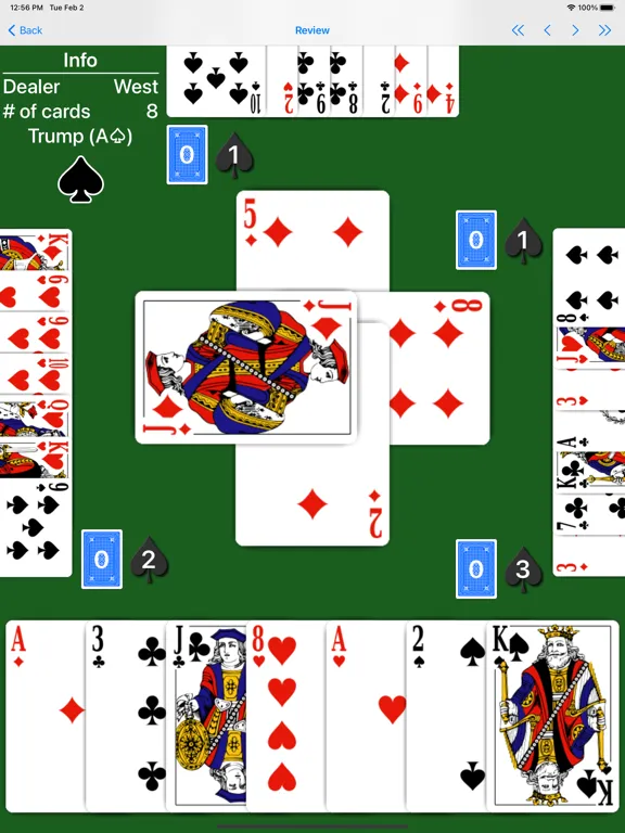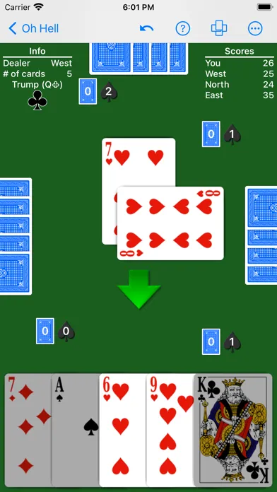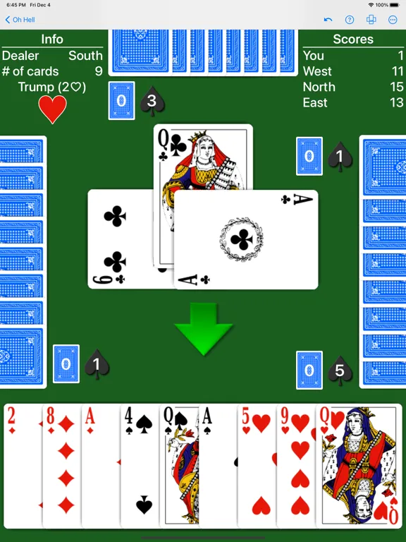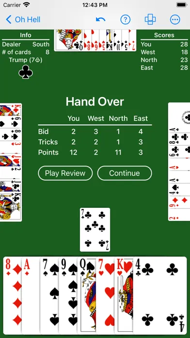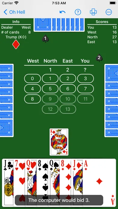 Play with the rules you like against the challenging NeuralPlay AI. The NeuralPlay AI is designed to play many different Oh Hell variants, including Romanian Whist and La Podrida. Six levels of AI play are waiting to challenge you!