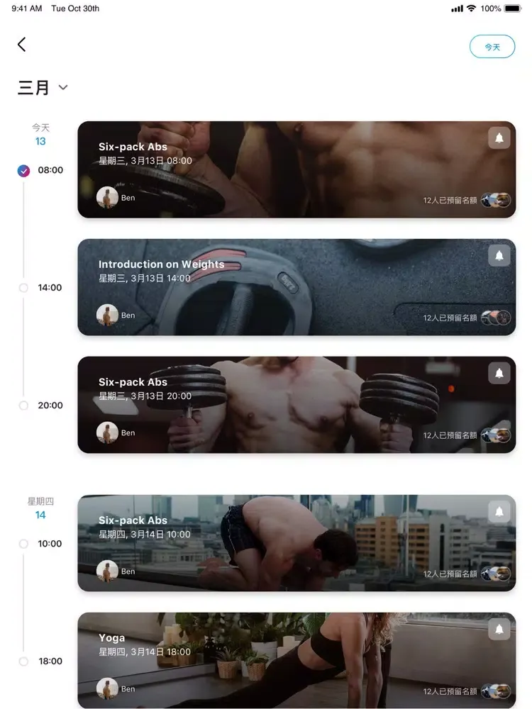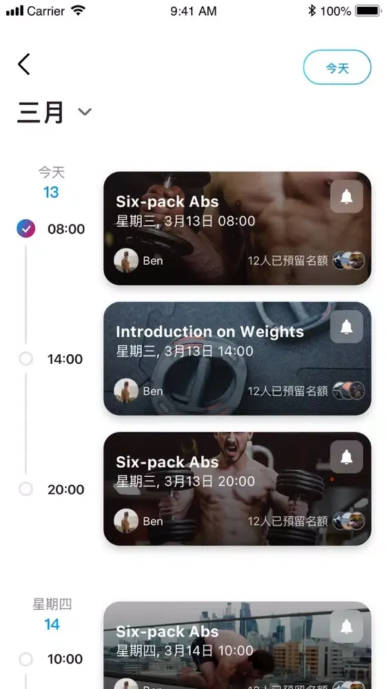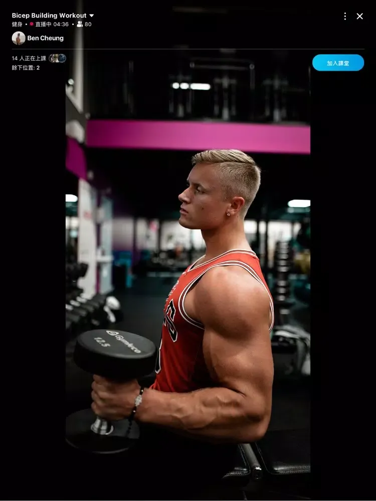 直播不同教練課堂,你可按喜歡的健身項目:冥想、瑜伽、健體、器械鍛煉、戶外訓練、拳擊或身心靈健康,跟著教練一起做。教練同步看到你做的動作,即時作指導及矯正