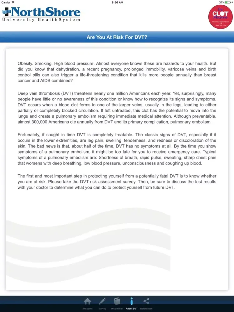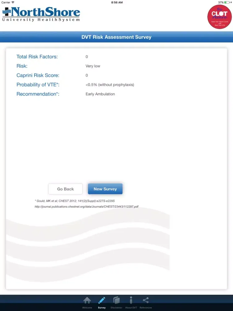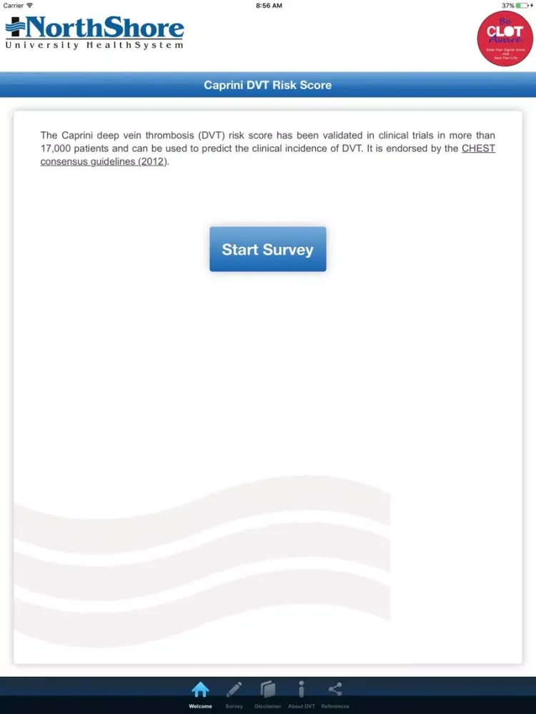 The Caprini deep vein thrombosis (DVT) risk score has been validated in more than 70 clinical trials in at least 200,000 patients worldwide as of 2017 and is endorsed by the Chest Consensus Guidelines (2012). Are You At Risk For DVT?