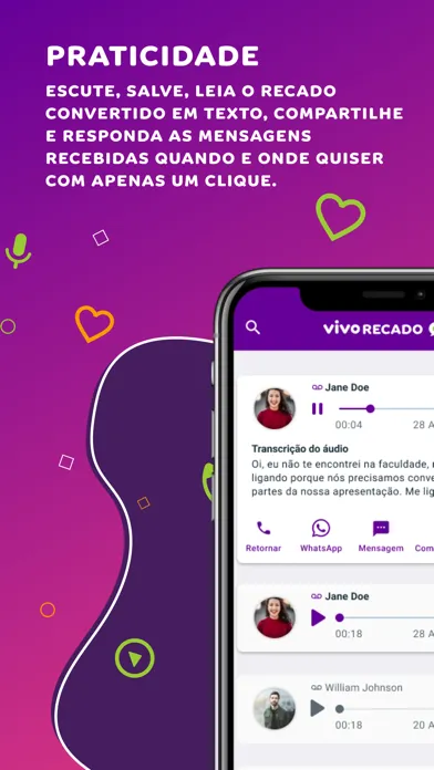 Praticidade: Escute, salve, leia o recado convertido em texto, compartilhe e responda as mensagens recebidas quando e onde quiser com apenas um clique.