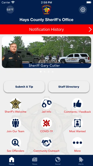 The Hays County Sheriff’s Office mobile application is an interactive app developed to help improve communication with area residents. The Hays County Sheriff App allows residents to connect with the Hays County Sheriff’s Office by reporting crimes, submitting tips, and other interactive features, as well as providing the community the latest public safety news and information.