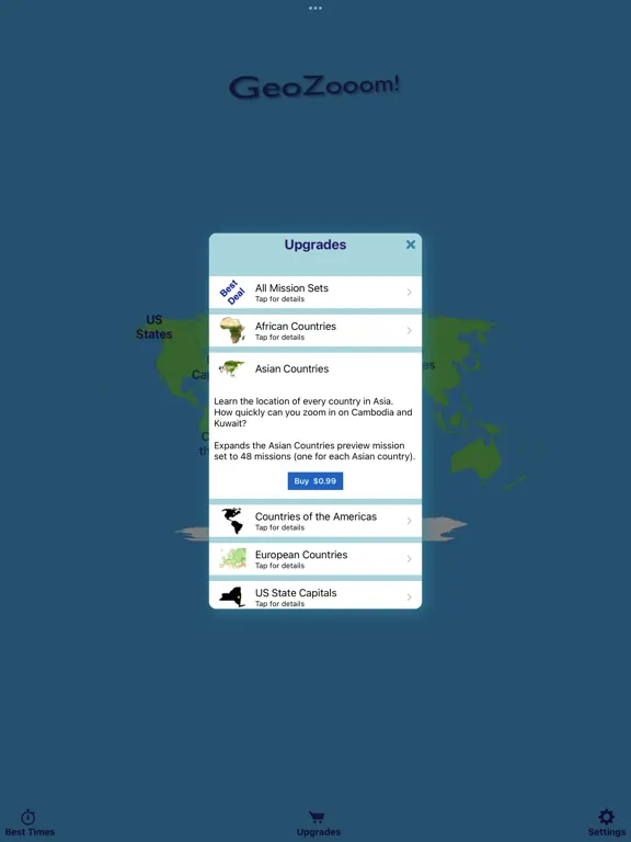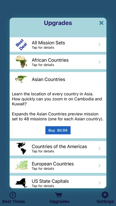 • Expandable. The following mission sets are available for purchase from within the app: US State Capitals, Countries of the Americas, African Countries, Asian Countries, and European Countries. From time-to-time, we also make bundles available for purchase that include all of the mission sets or all of the country mission sets.