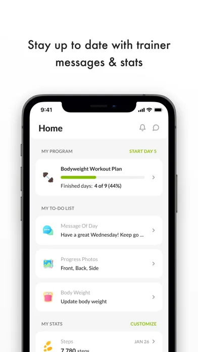 From the home page, view the messages from your fitness coach, view your daily fitness statistics, and see your daily nutrition overview. On this page, we also work with the Apple Health App to keep track of your steps and calories burned.