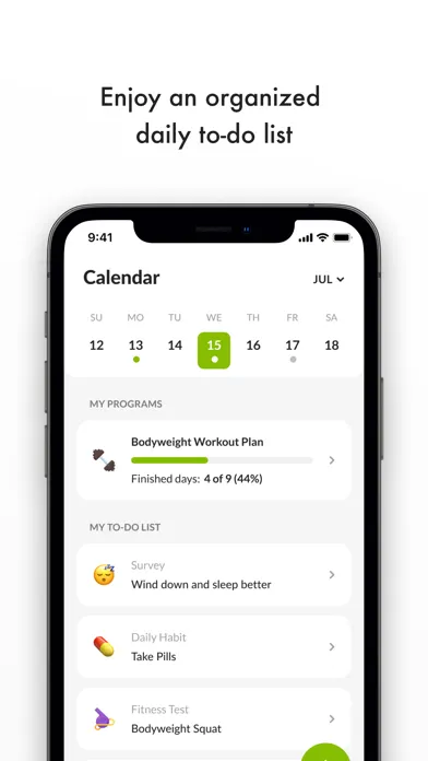 From there, slide over one tab to the fitness calendar that will act as your daily workout planner. When your coach assigns you a fitness plan, asks you to weigh yourself, track your daily nutrition macros, or requests a progress photo - you’ll find that to-do list right here. Clicking on the workout for the day will take you right to the first exercise of your fitness program.