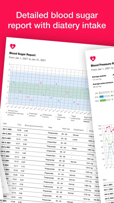 • Blood Sugar Report: all of your blood glucose readings with nutritional intake values, heart rate ranges, and classifications based on your diabetes type
