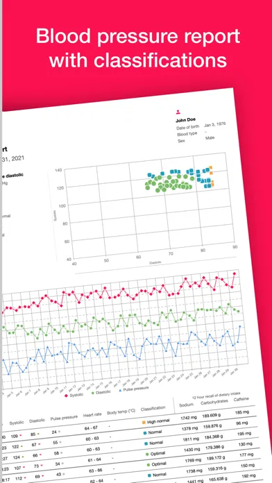 • Blood Pressure Report: scatter and simple line graphs of your blood pressure readings combined with the corresponding heart rate, body temperature, and 12-hour nutritional intake values(sodium, caffeine, carbohydrates)