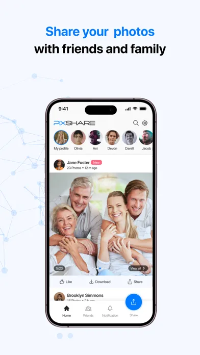 Effortlessly share life's memorable moments with PixShare. This innovative app automatically scans your photo library, detects faces, recognizes friends, and shares your treasured pics so you can relive experiences together.