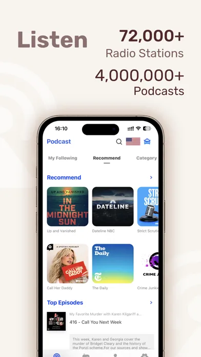 Listen to more than 70,000 radio stations and 130 million podcast episodes in more than 100 languages. Sports, Music, Interviews, News, Talk Shows, Education, Entertainment, TV, Movies, History, Culture, Books, Meditation, Sleep, Finance, Transportation and more.
