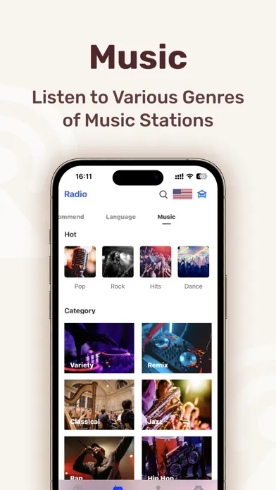· Explore: Search radio stations by name language, genre, country.