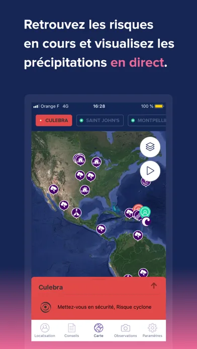 Bénéficiez de prévisions météo et d’avertissements personnalisés directement sur votre portable pour les localités de votre choix et lors de vos déplacements, en France et à l’international. Ne vous faites plus surprendre et adoptez les bons réflexes en suivant les conseils adaptés à chaque situation, selon la nature et l’ampleur du risque diagnostiqué.