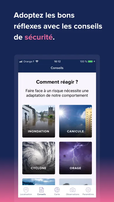 Afin de vous conseiller sur l’attitude à adopter face au risque, des conseils comportementaux gradués sont proposés pour chaque phénomène. Grâce à ces informations, prenez les mesures appropriées pour votre sécurité, celle de vos proches, ainsi que vos biens.