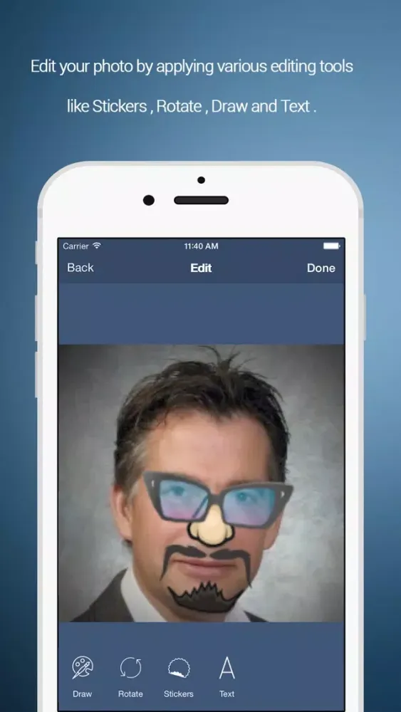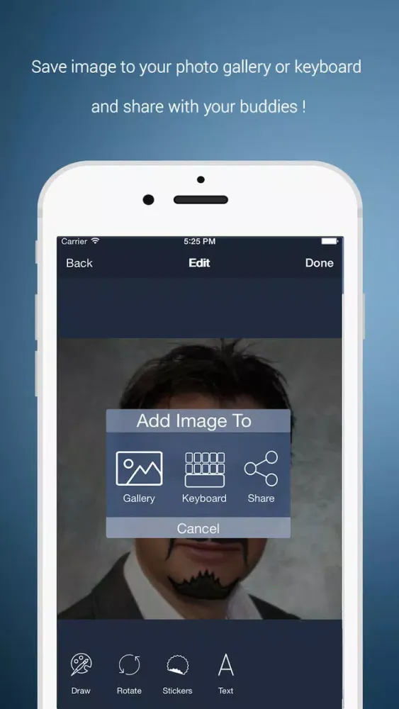 Pic2Key allows you to edit your photos and selfies. With its keyboard extension, you can use those pictures to share with your friends on native Mail app, Message app or WhatsApp! Now, create a photo story with your selfies and use it in chat. Please note that, the keyboard extension doesn't work with apps like Notes, Skype or Gmail.